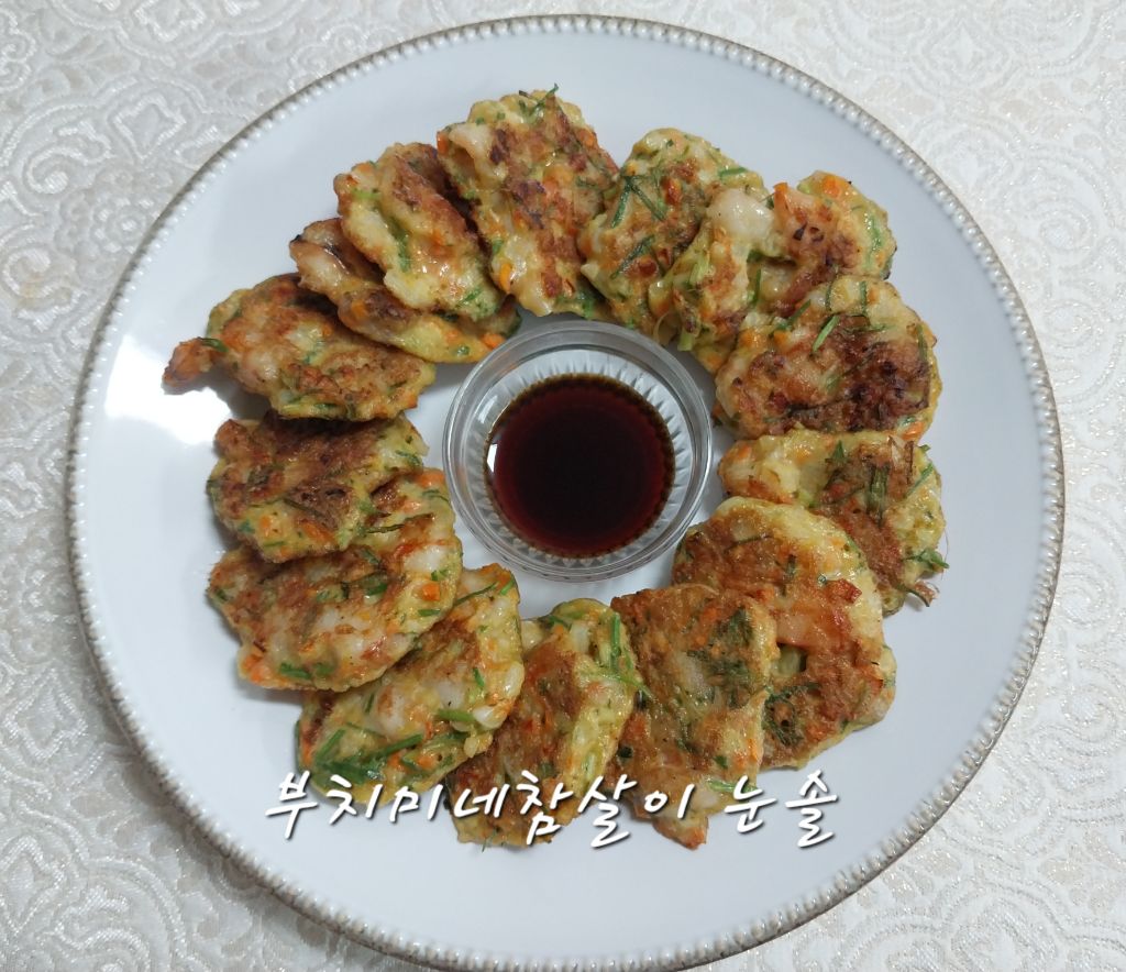 접시에 담아 초간장 곁들여 새우 채소전 완성