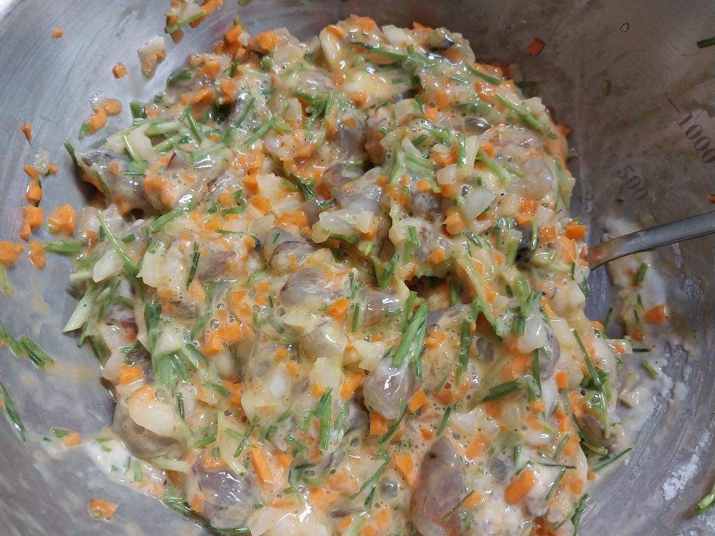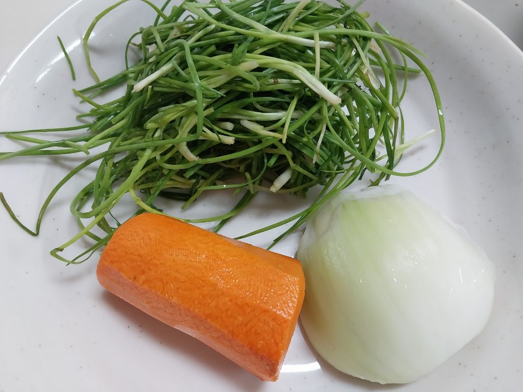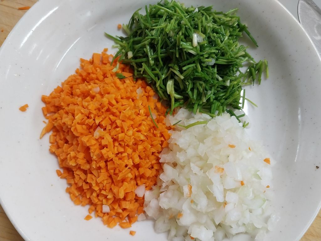 재료- 새우10마리,세발나물 한줌,당근1/3개,양파1/3개(중),달걀3개,