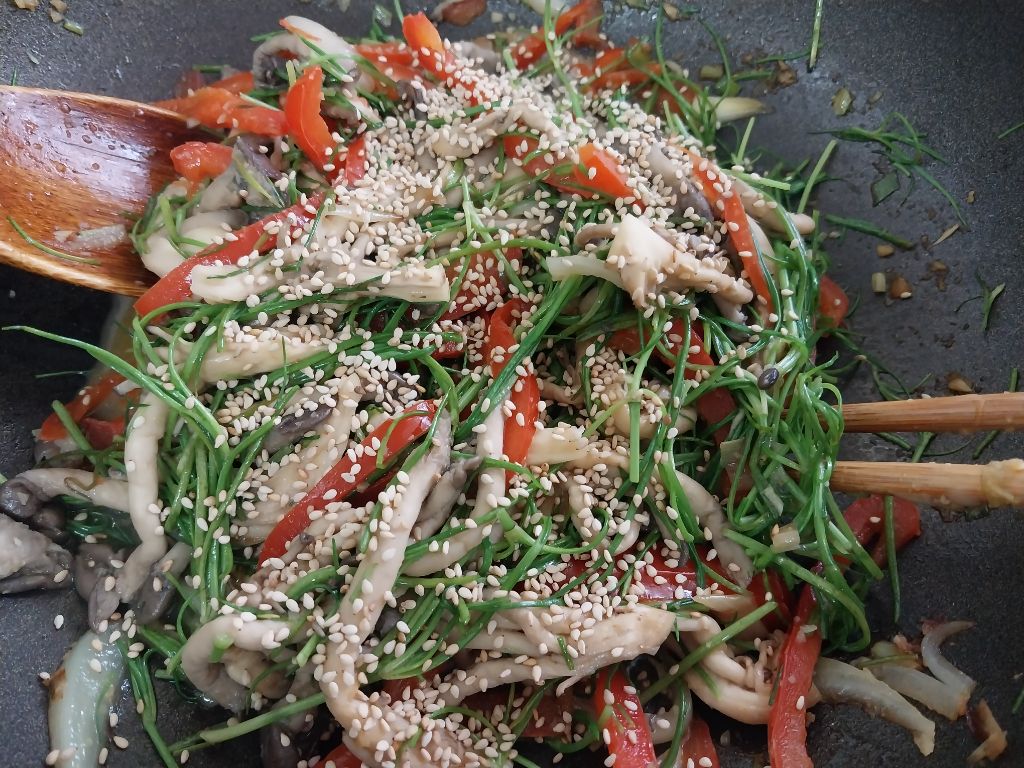 세발나물 넣어 살짝 볶아 통깨 넣어 느타리버섯 채소 볶음 완성