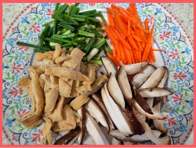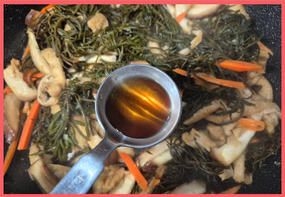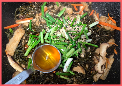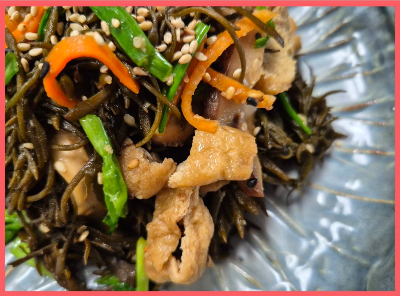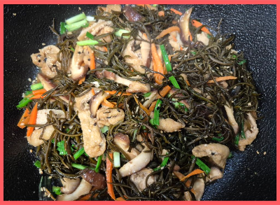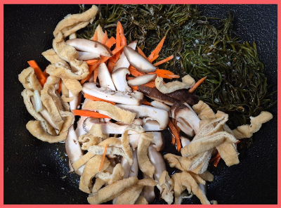재료:톳 400g, 유부 53g, 당근 25g, 표고버섯 2개, 쪽파 24g