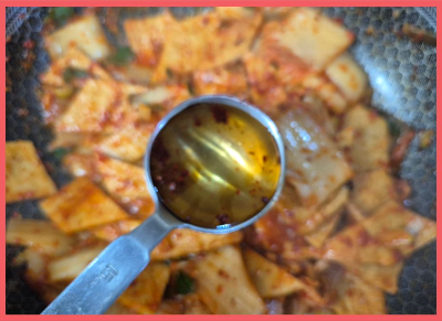 고춧가루 1T, 알룰로스 1T, 통깨 1T. 후춧가루 톡톡, 식용유 1T