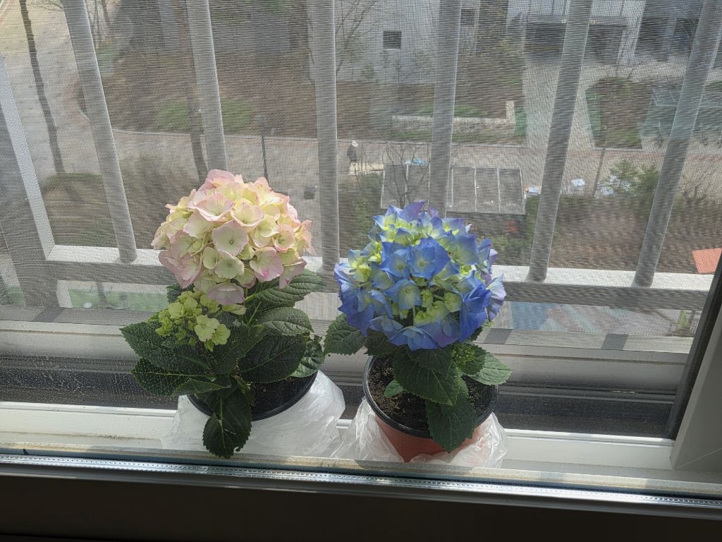 베란다 창위에 수국이 이뻐요