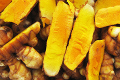 - 생약명 : 울금 (鬱金), 을금(乙金), 걸금(乞金), 옥금(玉金), 심황(深黃), 황제족(黃帝足) - 주요성분: 쿠루쿠민 1~3%, 정유 1~5%, 녹말 30~40%, . 노란색소는 쿠르쿠민이 그 주성분입니다. 정유의 주성분은 투르메론, 데히드로투르메론이 약 50%, 진기베렌, 디알파펠란드렌, 씨네올, 알파사비넬, 보르네올. 우리가 매운 음식을 먹으면 몸에 열이나면서 땀이 나는 것도 같은 이유.(울금의 성질은 차다) 최근의 연구를 종합하면 간장해독촉진, 담즙분비촉진, 담도결석 제거, 강심, 이뇨, 항출혈, 항균, 항궤양, 혈중콜레스테롤 억제 등이 알려졌고 간염, 특히 만성 C형, 담도염, 황달, 위염, 생리불순, 고혈압, 동맥경화 등에 대한 효능과 항암, 항당뇨에 대한 기대가 크다. 또 노화나 만병의 근원인 활성산소의 제거나 항산화작용에도 주목되는 재료이다 * 기를 소통시키고 울체된 것을 풀어주며, 피의 열을 내려주고 어혈을 치료한다.