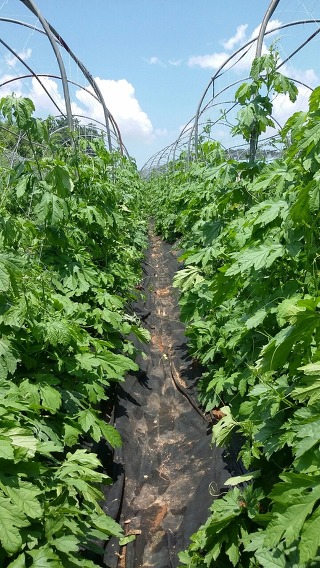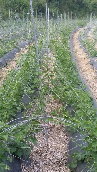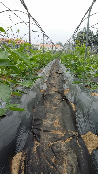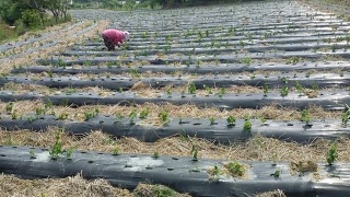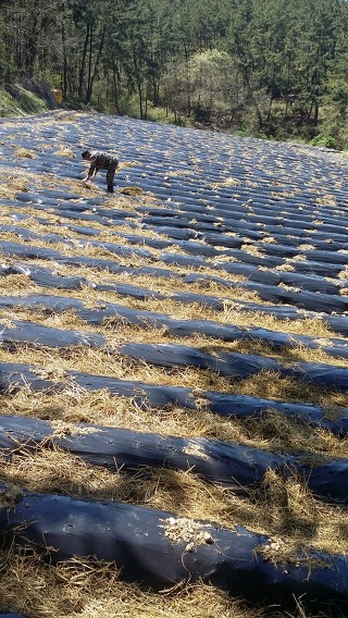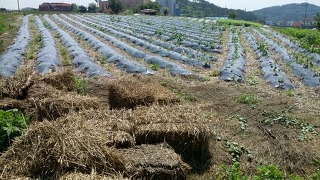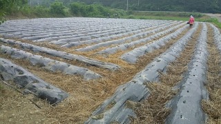 작다골 백수오농장 1,200평 중 윗밭. 비닐로 멀칭을 하고 고랑 사이는 모두 볏짚으로 멀칭을 하였네.