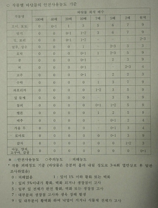 이 "매뉴얼"에 따르면 각 작물마다 적절한 바닷물 안전사용 희석비율이 다른데 마늘, 양파, 고구마 등은 바닷물 원액을 살포해도 괜찮을 정도로 염분에 강하고 오이나 포도 등은 100배 희석해서 살포해야 할 정도로 약하다. 희석농도를 지키지 않고 사용하면 잎이 황백화되고 말라 죽는 피해가 있을 수 있기에 각 작물별로 정해진 희석농도를 반드시 지키라고 권고한다.