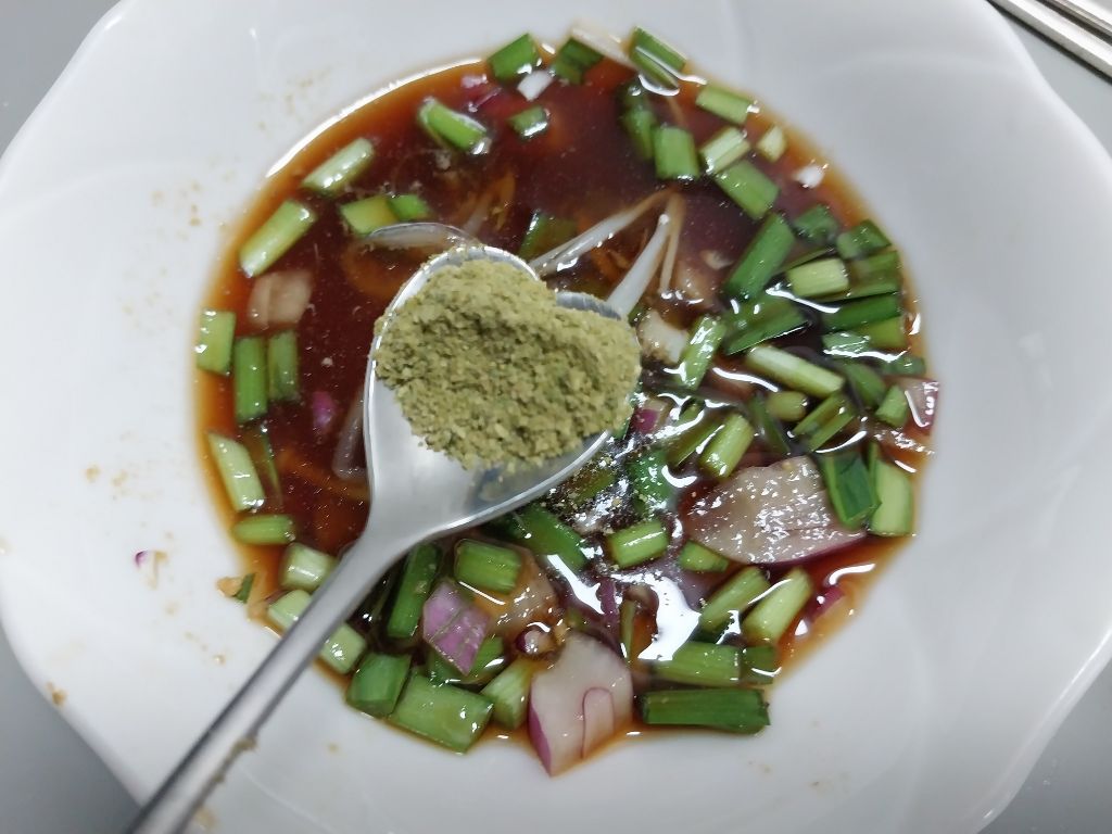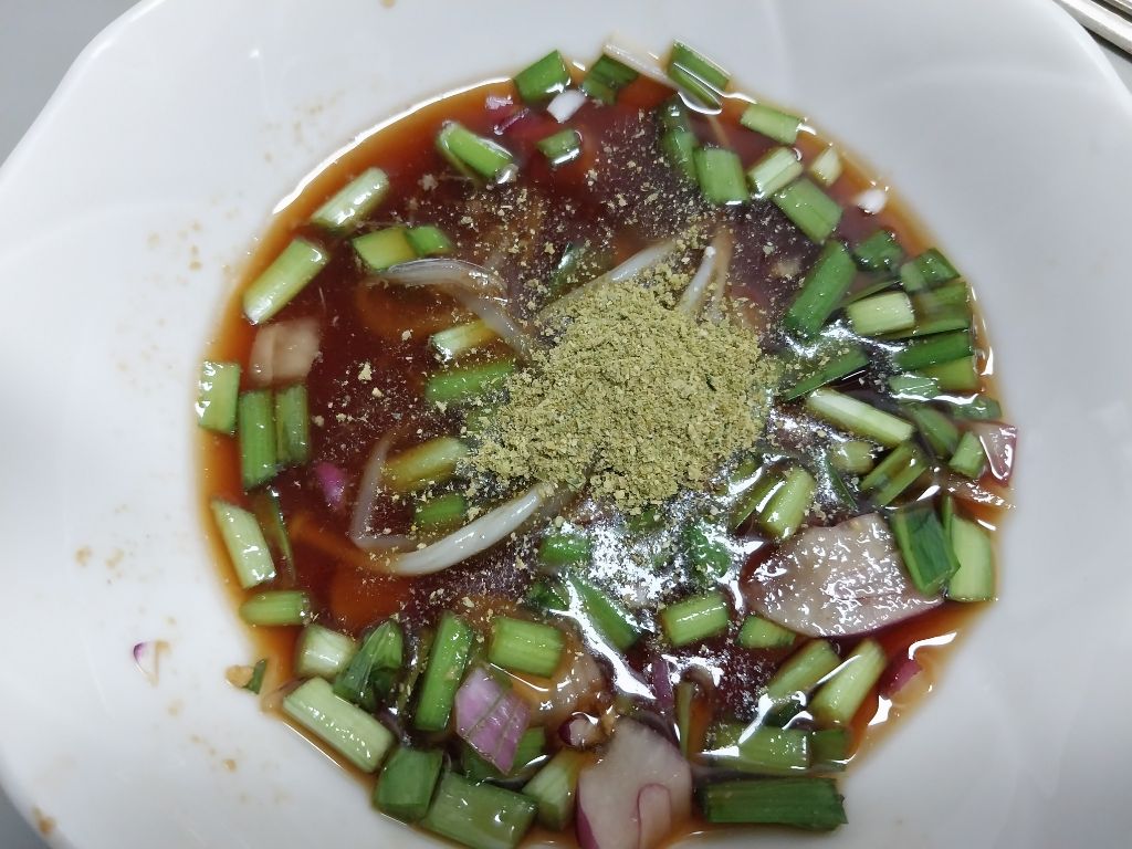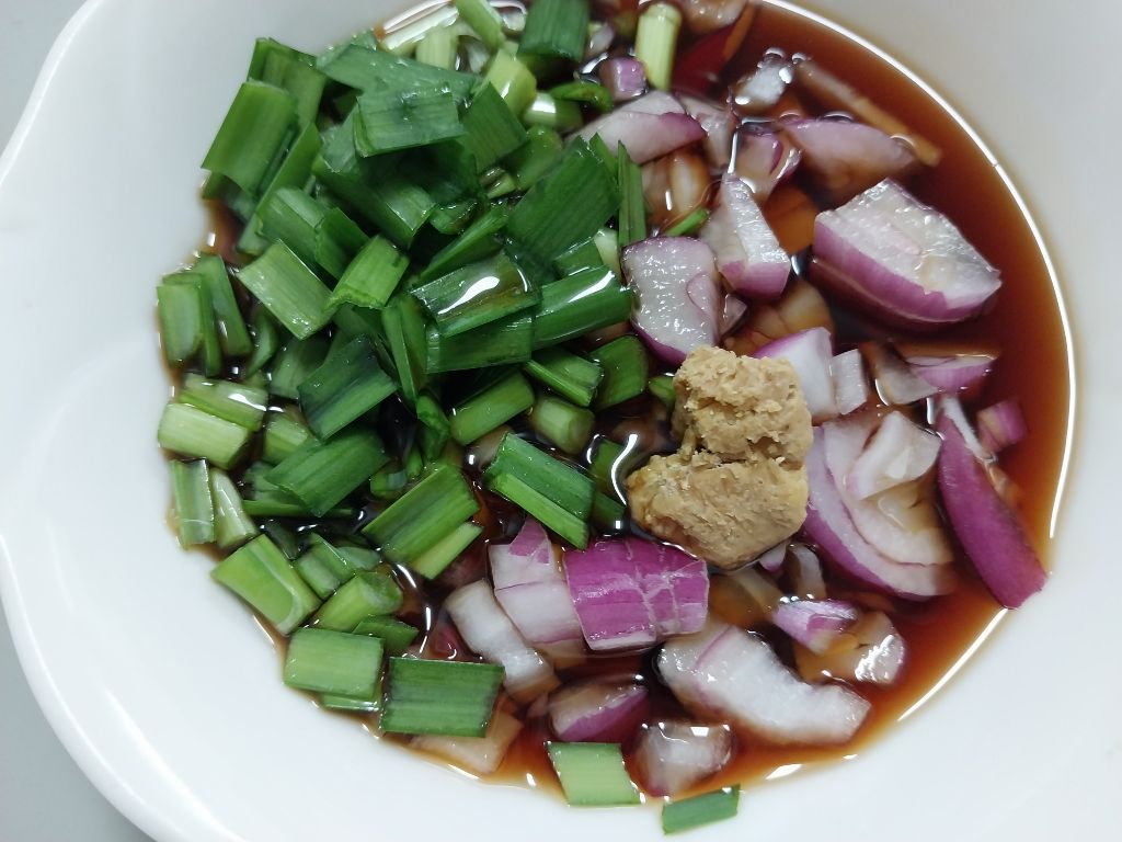 간장소스- 만능간장3큰술,다진양파1큰술,잘게 썬 부추1큰술,겨자1t,풋청양고춧가루1t