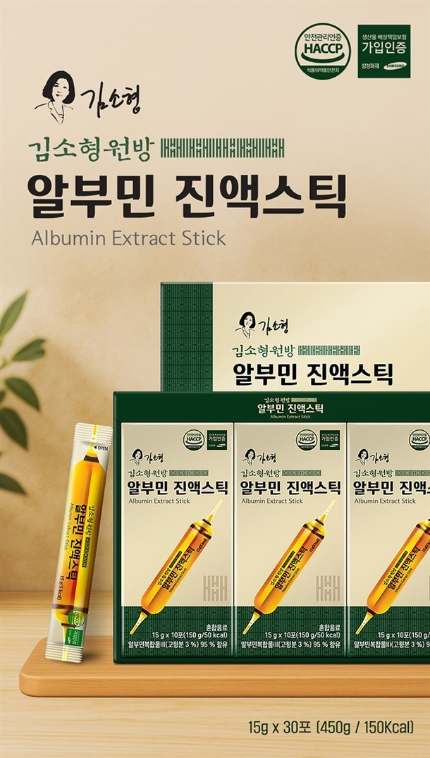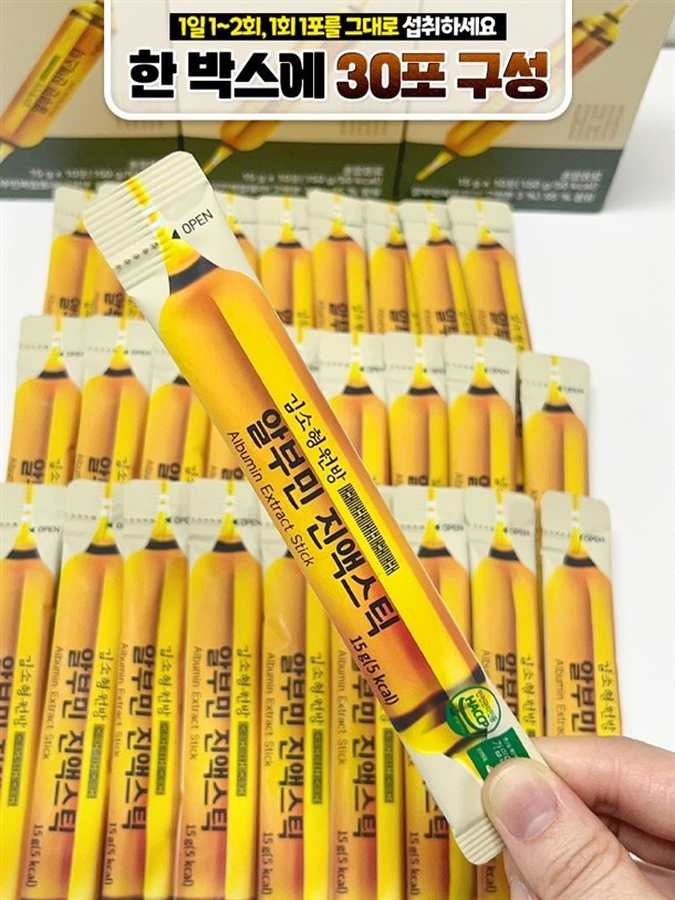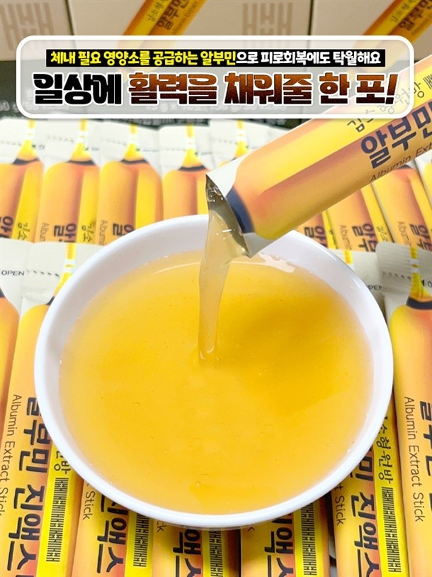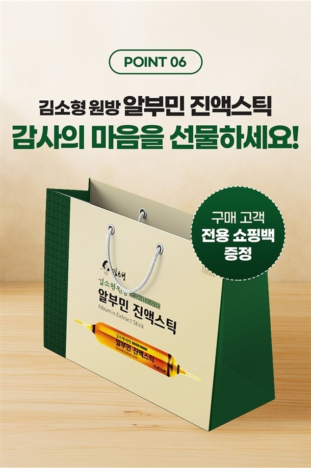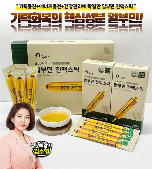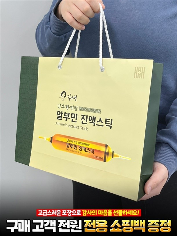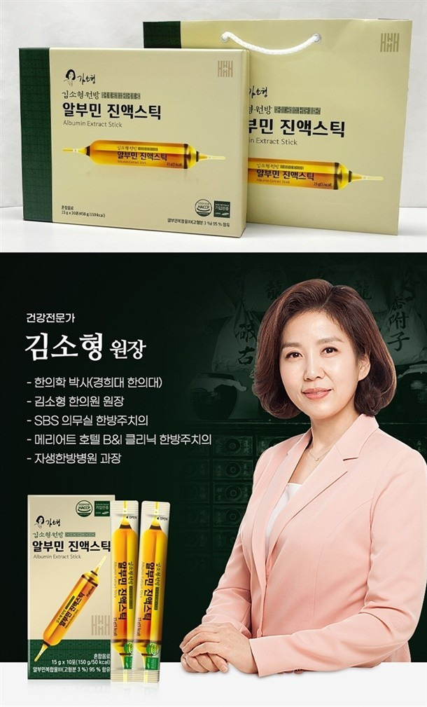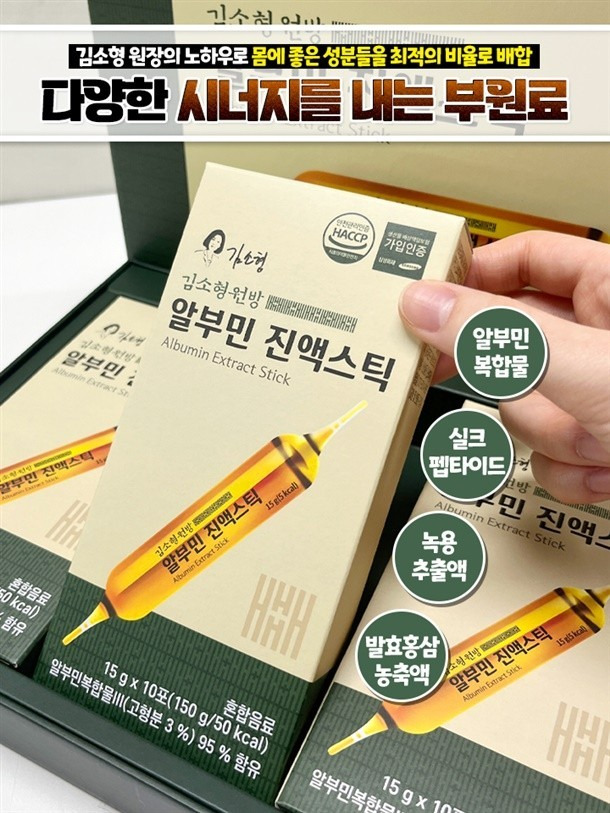 | 정품 김소형 알부민 진액스틱 15ml x 30포+쇼핑백 내일 재입고됩니다!! 저희가 판매하는 알부민중 가격대비 가장좋은거라 추천드립니다^^ 링거 1회 맞는효과~~~ 재구매율 91.8%~ 피로회복과 기력증진... 한의사 김소형원장의 알부민~ 15ml*30포 선물세트(쇼핑백증정) 정가:39,100원 기력증진+에너지충전 돕는 마시는 액상형 알부민 진액스틱!! 실크펩타이드, 녹용추출액, 6년근 발효홍삼까지 함유되어 시너지 내는 부원료로 효과 UP!! 상큼달달한 맛으로 누구나 거부감없이 섭취 가능해요^^ 구매고객전원 전용 쇼핑백 증정으로 선물용으로도 탁월해요~^^ 유통기한 27년이후 판매가 1박스 30포 12,500원 배송비3,500원 도서산간6,500원 |