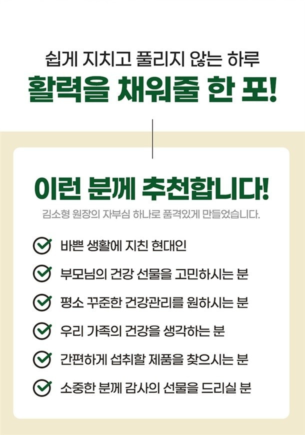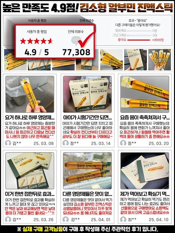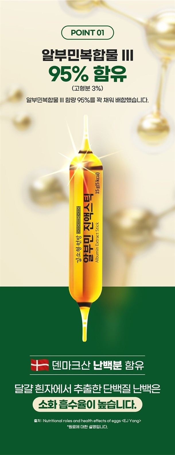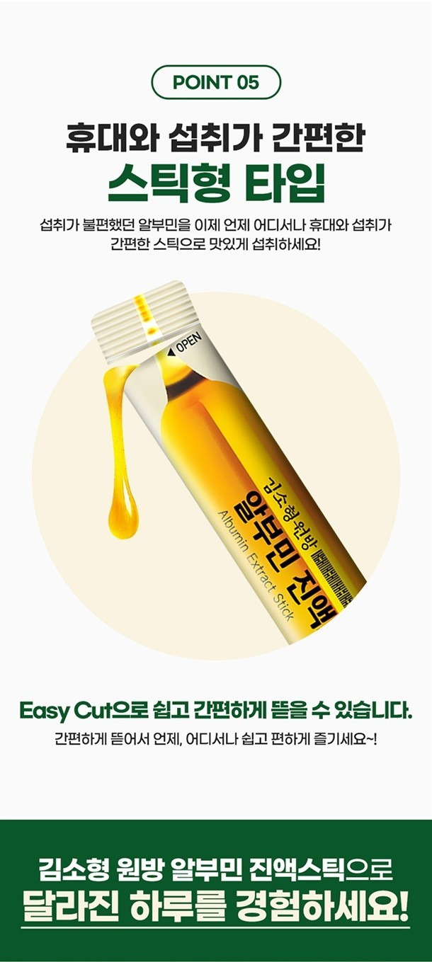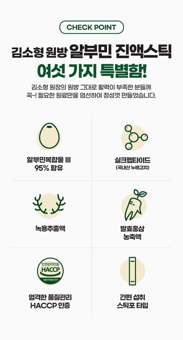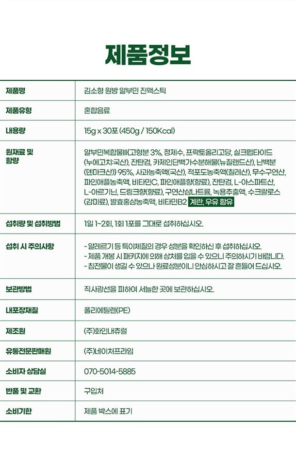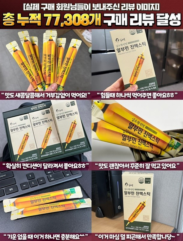 | 정품 김소형 알부민 진액스틱 15ml x 30포+쇼핑백 내일 재입고됩니다!! 저희가 판매하는 알부민중 가격대비 가장좋은거라 추천드립니다^^ 링거 1회 맞는효과~~~ 재구매율 91.8%~ 피로회복과 기력증진... 한의사 김소형원장의 알부민~ 15ml*30포 선물세트(쇼핑백증정) 정가:39,100원 기력증진+에너지충전 돕는 마시는 액상형 알부민 진액스틱!! 실크펩타이드, 녹용추출액, 6년근 발효홍삼까지 함유되어 시너지 내는 부원료로 효과 UP!! 상큼달달한 맛으로 누구나 거부감없이 섭취 가능해요^^ 구매고객전원 전용 쇼핑백 증정으로 선물용으로도 탁월해요~^^ 유통기한 27년이후 판매가 1박스 30포 12,500원 배송비3,500원 도서산간6,500원 |