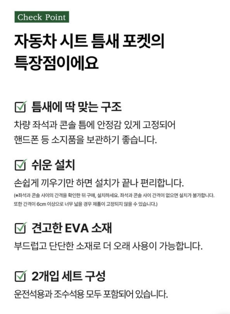 | 블루밍 자동차 틈새&수납쿠션 저는 이제품 보자마자 웃었습니다ㅎㅎ 어제도 주머니에서 폰이흘러서 옆에 빠트렸거든요ㅠㅠ 🚗 완벽 밀착! EVA 틈새포켓으로 깔끔한 드라이빙 환경을 만들어 보세요! ✨ 운전 중 시트 틈새로 휴대폰, 지갑, 동전 등 소지품을 떨어뜨려 당황했던 경험, 이제 그만! EVA 틈새포켓이 그 고민을 시원하게 해결해 드립니다. 🔥 왜 이 제품을 선택해야 할까요? 핵심 장점 3가지! 1. 시트 움직임에도 걱정 없는 완벽한 유연성! 유연한 EVA 소재: 차량 시트의 앞뒤 움직임이나 등받이 각도 조절에도 틈새에 유연하게 밀착되어 들뜸이나 이탈 걱정이 없습니다. 어떤 차종이든, 어떤 운전자세든 완벽하게 커버합니다. 2. 틈새 & 수납을 한 번에! 완벽 커버 솔루션 틈새 낙하 방지: 시트와 콘솔 사이의 틈새를 완벽하게 막아주어 휴대폰, 카드, 동전 등의 소지품이 떨어지는 것을 근본적으로 방지합니다. 실용적인 수납공간: 잃어버리기 쉬운 작은 물건들을 깔끔하게 정리할 수 있는 추가적인 수납공간을 제공하여 차 안을 더욱 쾌적하게 유지해 줍니다. 3. 소지품 안전 지킴이! 주머니에서 실수로 빠지기 쉬운 휴대폰, 지갑, 열쇠 등을 안전하게 보관할 수 있어 운전에 더욱 집중할 수 있게 도와줍니다. EVA 틈새포켓으로 번거로운 소지품 낙하 걱정은 덜고, 깨끗하고 편리한 드라이빙을 시작하세요! 최저판매가 1세트 4,000원 배송비3,500원 도서산간6,500원 |
