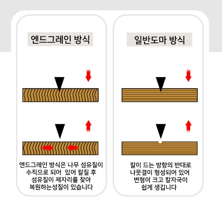 엔드그레인 방식은 나무결을 위로 세워 제작하는 방식이라