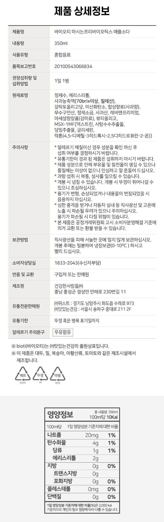 프리바이오틱스 애플소다맛 1박스 350mlX24병올리브영에서 인기있는 음료입니다~^^유통기한2달남아 비싼음료 땡처리 나왔습니다.선착순 한정수량 판매라 댓글로 꼭 주문수량 남겨주세요!!^^밥 먹고 나면 속은 더부룩~한데, 시원한 음료수는당, 뱃살 걱정에 마음 편히 마실 게 없어서 꾹꾹 참으셨던 우리 회원님들!!이제 더 이상 참지 마세요! 맛, 장 건강, 피부까지 한 번에 챙기는바이오티 마시는 프리바이오틱스 애플소다를 데려왔답니다. 🎉1️⃣ 가루 유산균 대신, 맛있게 하루 한 병 꿀꺽! 🌿유산균 먹이(프리바이오틱스)가 1,500mg 듬뿍 들어있어 한 병이면 하루 섭취량 끝! 위산에도 살아남아 장까지 튼튼하게 갑니다.2️⃣ 마실수록 예뻐지는 콜라겐 지킴이! 🌹 단순한 음료가 아니에요! 2중 특허받은'뷰티올리고' 성분이 들어있어 내 몸속 소중한 콜라겐이 빠져나가지 않게 꽉 지켜준답니다.3️⃣ 설탕 제로! 단 35kcal 초저칼로리! 🚫 설탕, 색소, 보존료 3無! 달콤 상큼한 사과맛 탄산을 시원하게 원샷해도 고작 35kcal라 살찔 부담이 전혀 없어요. 🍏💦유통기한 26년5월15일최저판매가 1박스24병 무료배송 10,000원배송비3,500원 도서산간6,500원