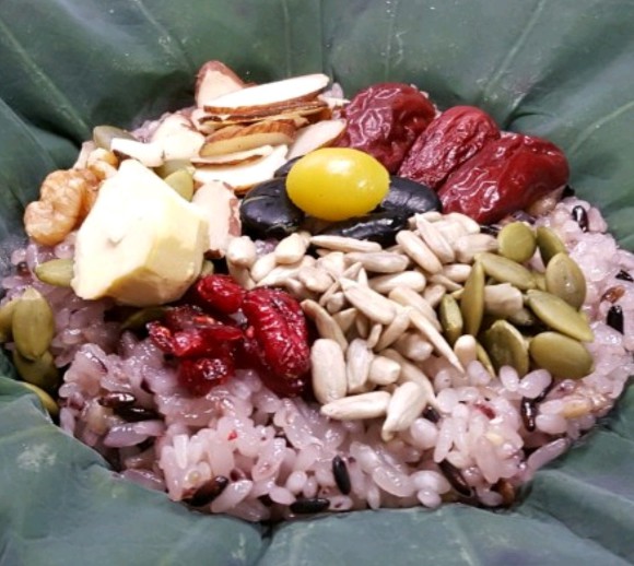 90%이상 찹쌀(국내산100%), 7가지잡곡10%(국내산100%)의 환상적인 혼합과 9가지고명(검은콩,밤,대추:국내산,
