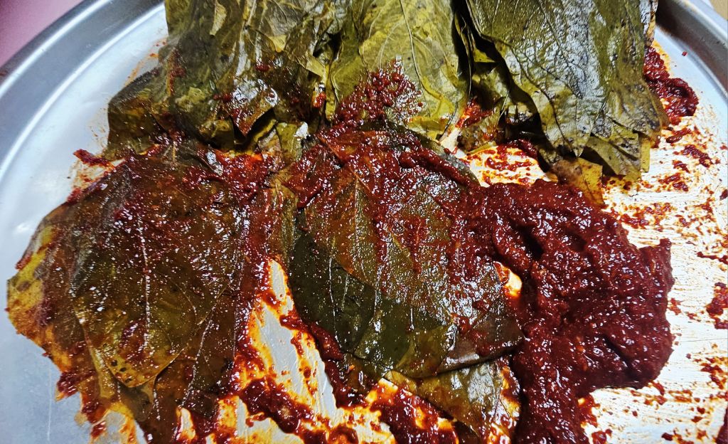 메주콩잎 소금에 절인것 꺼내어~