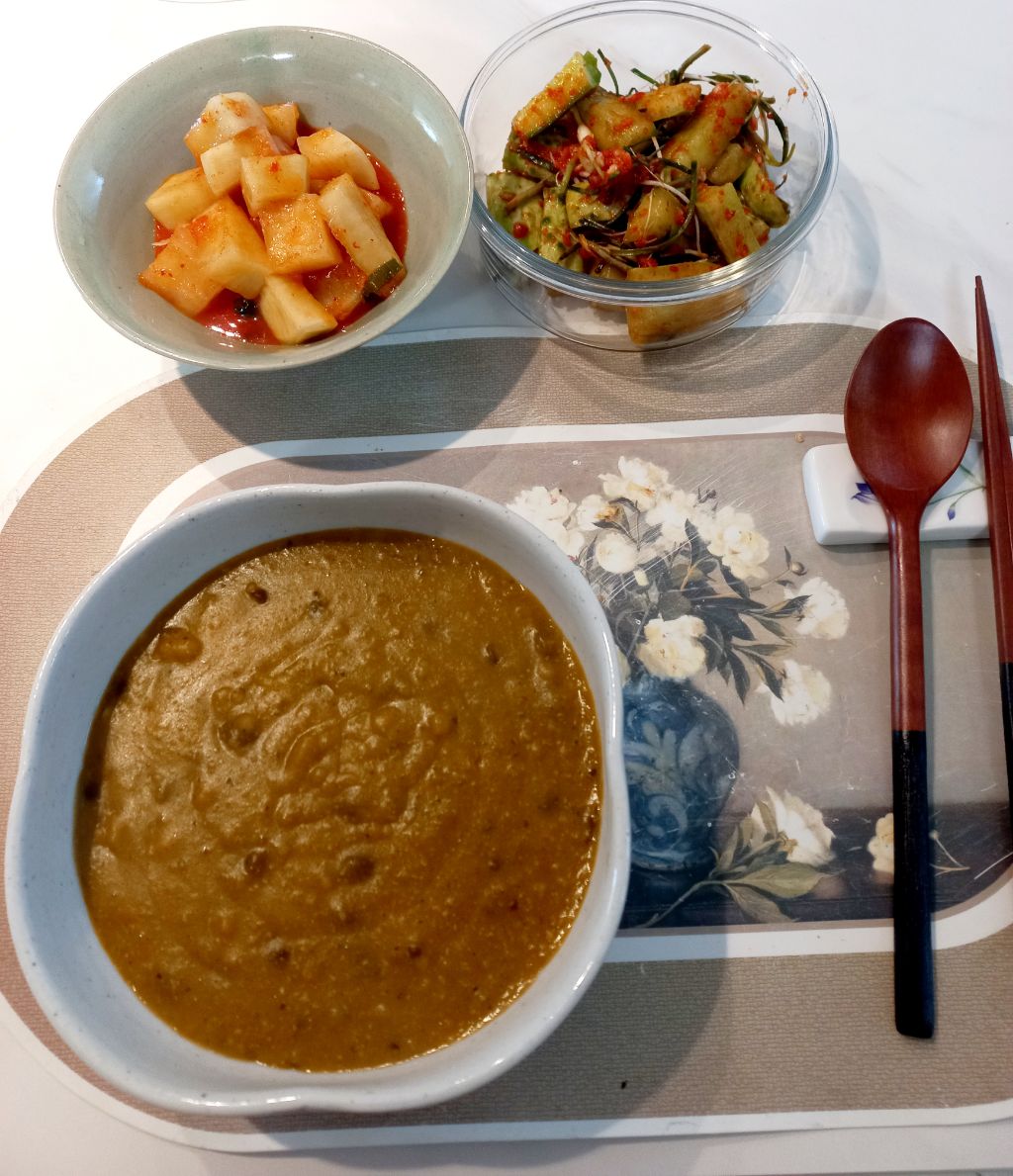 나를위한 호박죽 끓여 깍두기와 달래넣어