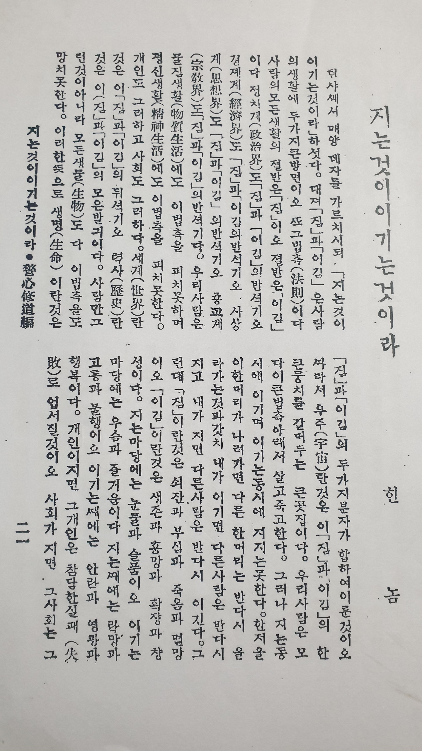 천사(天師)께서 매양 제자(弟子)를 가르치시되 “지는 것이 이기는 것이라”하셨다. 대저 『짐』과 『이김』은 사람의 생활에 두 가지 큰 방면이요 또 그 법칙(法則)이다. 사람의 모든 생활의 절반은 『짐』이요 절반은 『이김』이다.