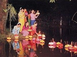 강에 연꽃 봉오리 모양의 초를 띄우며 소원을 비는 '러이 끄라통'은 지역축제가 활발한 태국에서는 흔치 않은 전국적인 규모의 축제이다. |