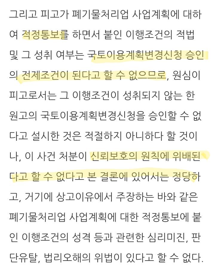 이때 폐기물관리법령에 의한 폐기물처리사업계획에 대한 적정통보는 국토이용관리법령에 의한 국토이용계획변경의 사전결정이 아니라는 취지에서 판시하였다고 이해해도 괜찮을까요? 그래서 신뢰보호원칙에 위배되지도 않고, 국토이용계획변경시에 적정통보의 요건이 전제요건도 되지 않은건가요?