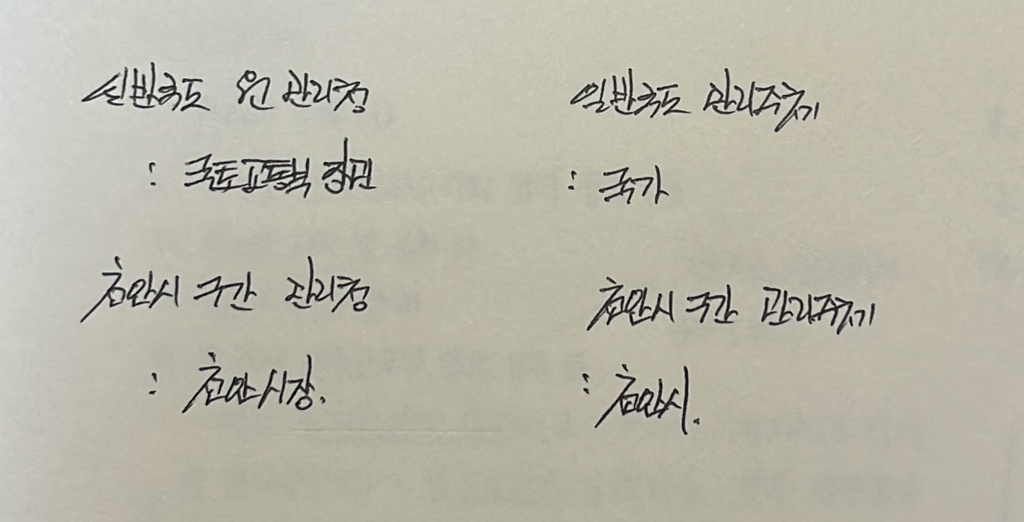 일반국도 중에 천안시를 지나는 국도의 관리청과 관리주체에 관해 질문 드립니다 제가 필기를 아래의 사진처럼 했는데 기관위임사무이므로 천안시 구간의 관리주체가 천안시가 아닌 국가가 되어야 하지 않나요?
