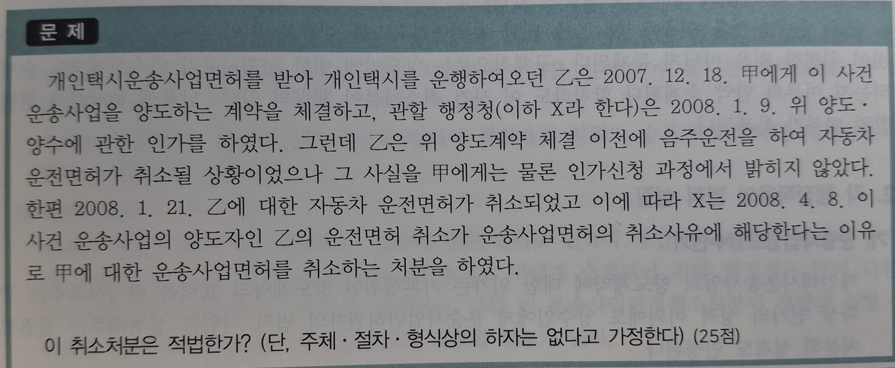 그런데 이렇게 부정설을 취할 경우 운송사업면허취소처분이 재량권 일탈 남용에 해당하는지 여부에 관한 논점을 빠트리게 되는 문제가 생기는 거 같습니다. 재량권 일탈 남용 관련 철회권 행사의 제한이 논의되어야 하는 것이 배점상 맞는 것처럼 보이는데도 말이죠.