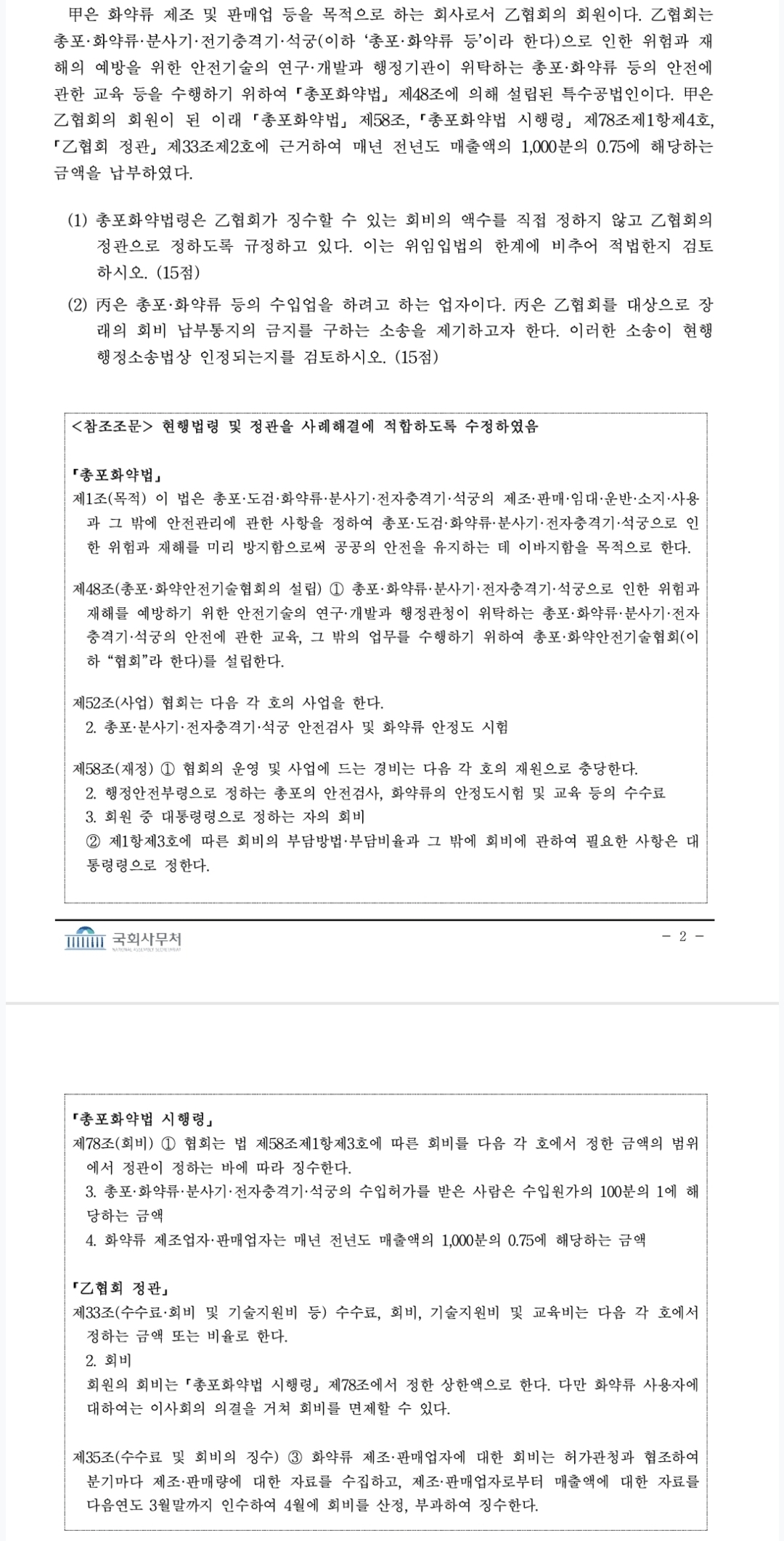 총포화약법에 회비 금액을 규정하지 않고 시행령과 정관에 위임하는 것은 의회 유보의 원칙에 반한다고 풀었습니다