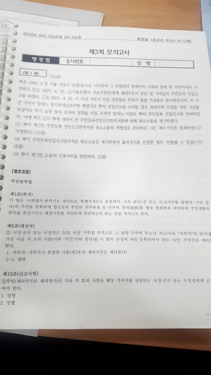 1. 3회 1문의 1에서 주민등록 전입신고를 수리를 요하는 신고로 포섭하셨는데, 주민등록법 제23조 제2항에 따라 자기완결적 신고로 볼 수는 없는지 궁금합니다.