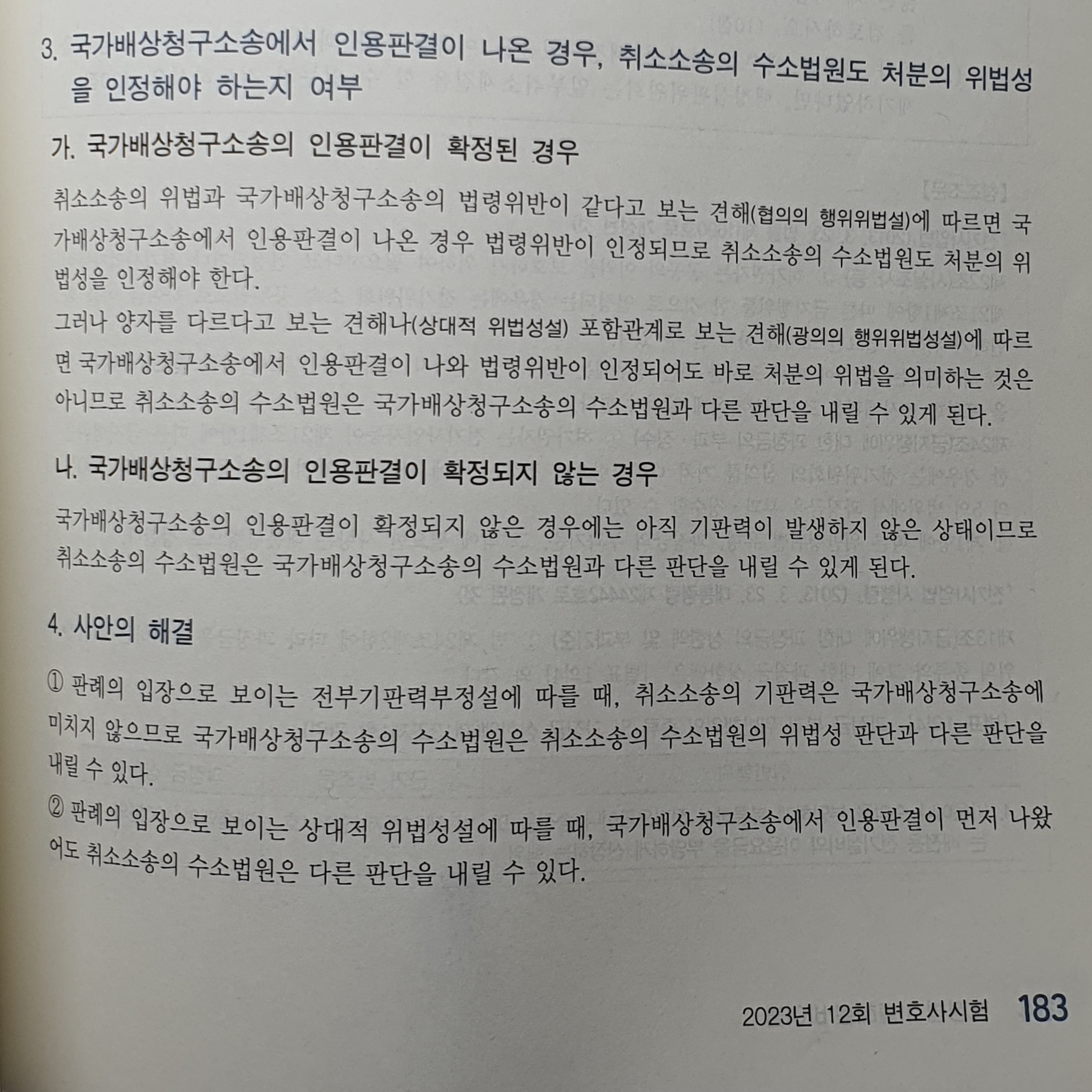 1. 이 경우 국가배상청구소송의 기판력이 미쳐서 취소소송의 수소법원이 처분의 위법성을 인정하게 되는 것이 아니라,