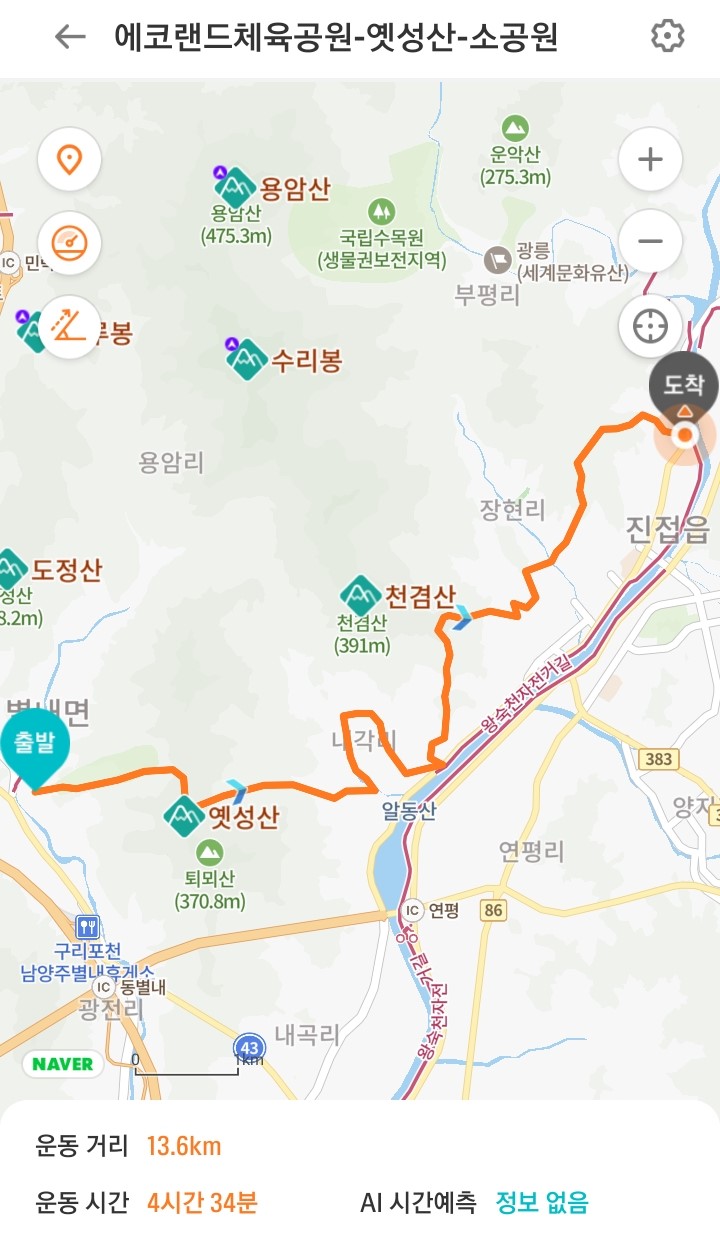 산행코스 = 별내면사무소-에코랜드-(옛성산-260봉-200봉)-장승마을
