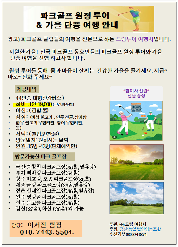 파크골프의 계절~ 가을 파크 원정경기 예약받습니다..지금 전화주세요 010 7443 5504 작성자전진|작성시간25.08.25|조회수88 목록 댓글 0 글자크기 작게가 글자크기 크게가 다음검색 현재 게시글 추가 기능 열기 북마크 공유하기 신고 센터로 신고 댓글 댓글 0 댓글쓰기 답글쓰기 댓글 리스트