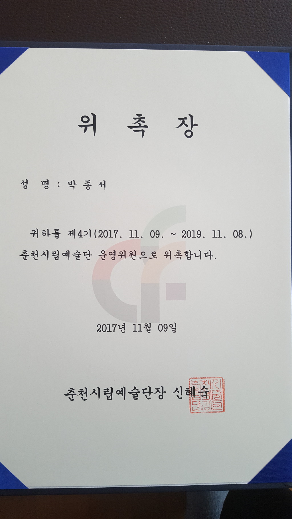위촉장 작성자박선생|작성시간18.01.09|조회수35 목록 댓글 1 글자크기 작게가 글자크기 크게가 춘천시립예술단 운영위원 다음검색 현재 게시글 추가 기능 열기 북마크 공유하기 신고 센터로 신고 댓글 댓글 1 댓글쓰기 댓글 리스트 작성자돌개바람 | 작성시간 18.01.10 박종서쌤~!시립예술단운영위원 되심을축하합니다~!~ㅉㅉㅉㅉㅉ^^~*~ 댓글 전체보기