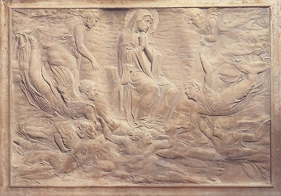 밝은 빛에서만 그 아름다움이 드러나는 매우 정교하게 조각된 〈승천하며 성 베드로에게 천국의 열쇠를 주는 예수