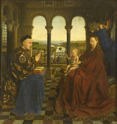 얀 반 에이크의 종교화는 대부분 성모자상을 그린 것인데 그 가운데 1435년경에 제작된 [니콜라 롤랭 수상의 성모 Madonna of Chancellor Nicolas Rolin]는 중요한 의미가 있는 걸작이다. 그림 왼쪽에 등장하는 남성이 이 작품을 주문한 니콜라 롤랭으로 부르주아 계급 출신으로 부르고뉴 공국에서 선왕 장(Jean sans Peur)에 이어 필리페 3세를 위해 봉사하며 신임을 얻어, 공작으로부터 수상의 직위와 귀족의 작위를 하사 받은 공국 최고의 실력자이자 최고 부자 중 하나였다. 그가 고향인 프랑스의 오텅(Autun)에 있는 교회의 가족 채플에 보낼 목적으로 그린 이 그림에서도 그는 실제 생활에서처럼 특권적인 지위를 차지한 인물로 그려지고 있다.
