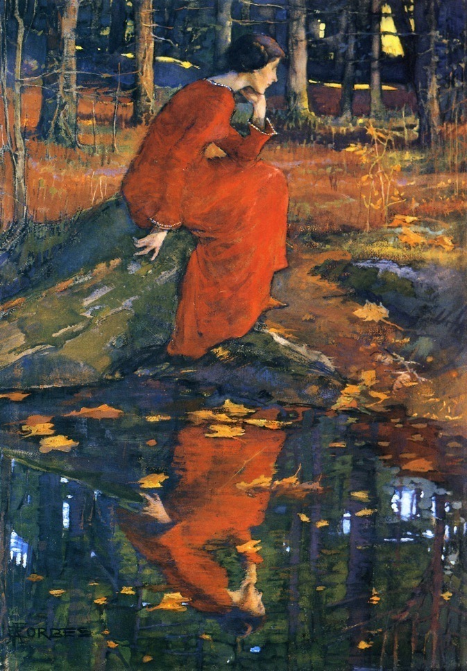 포브스의 아내 엘리자벳의 작품입니다. 가을 숲 끝에 노란 햇살이 걸렸지만 물가에 앉은 여인의 모습 때문에