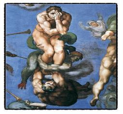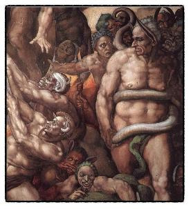 “악마와 뱀에게 사로잡혀 있는 절망의 천벌을 받는 영혼은 내면의 고통으로 괴로워하고 있습니다. 그 고통은 미켈란젤로 자신의 고통과 유사하다고 생각했습니다. 그는 이 작품을 그리면서 절망과 회의를 느꼈고, 차마 눈 뜨고 볼 수 없다는 반대자들에 의해 그림 전체를 없애야 하는 두려움에 사로잡혀야했습니다”