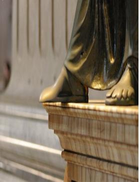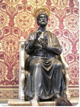 “중세기 때부터 이곳을 찾는 수많은 순례자들이, 특히 이 청동상의 발에 입 맞추며 기도를 바치는 전통 때문에, 현재 오른쪽 발가락은 거의 다 닳 아서 그 원 모양이 없어지고, 이제는 발가락도 많이 닳은 상태입니다”