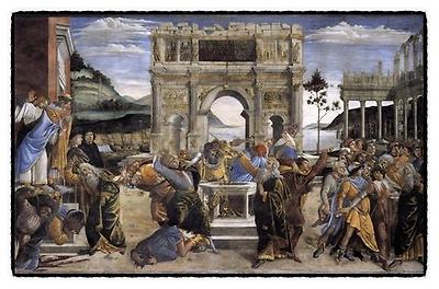 ![]() 모세의 생애⑤ 모세와 이른이 코라를 징벌, 프레스코, 1481년 작, 350× 572㎝ |