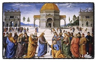 ![]() 예수의 생애 ⑤ 베드로에게 열쇠를 맡기시는 그리스도, 프레스코, 1481- 1482년 작, 350× 572㎝ |