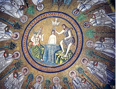 6세기 라벤나에 지어진 아리우스파를 위한 세례당의 천장 모자이크에서 강둑에 올라서 있는 세례자 요한은 성서에 묘사된 대로 낙타털 옷을 입고 있는 고행자의 모습이다. 초기 그리스도교 시대의 작품에서처럼 세례 요한의 손은 예수의 머리에 놓여있고, 그리스도는 알몸으로 강 물 속에 반쯤 잠긴 모습이다. 무엇보다 이 모자이크에서 가장 흥미로운 점은 화면 왼쪽, 상의를 벗고 허리춤에 물통을 차고, 갈대를 들고 있는 흰 수염의 노인이다. 그가 지닌 물동이에 주목하면, 그곳에서 흘러나온 물이 강을 이루고 있음을 알 수 있다. 바로 이 노인은 요르단 강을 의인화 한 것으로, 산, 물, 바람 등 자연을 의인화 했던 그리스인들의 방식이 그리스도교 문화에 여전히 남아있었음을 보여주는 예이다. 또 비둘기는 원추형의 빛을 예수의 머리위로 뿌리고 있다. 한편 이 세례도상을 둘러싸고 있는 열 두 사도가 받치는 금빛 화환(wreath)은 로마 황제에게 신하들이 받쳤던 것으로, 예수의 권의를 드러내기 위해 로마의 전통에서 빌려온 것이다. 또 사도들 사이사이에 그려진 식물은 올리브 나무로, 늘 푸른 올리브 나무는 천국을 상징하는 모티브이기도 한다. | |