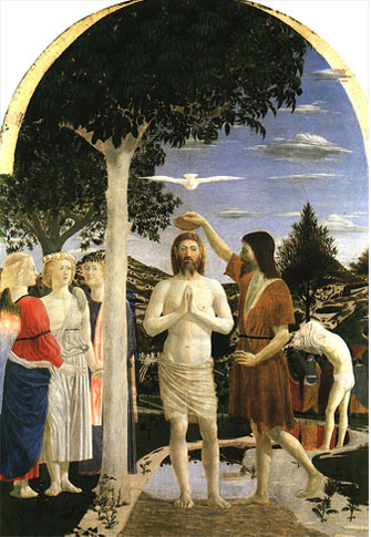 1440년경에 그려진 피에로 델라 프란체스카(Piero della Francesca)의 [그리스도의 세례]는 당시 이탈리아의 평원과 산을 배경으로 한다. 수학자이기도 했던 화가는 이 작품에 엄격한 수학적 비례를 적용했다. 화면 중앙, 예수의 머리와 성령의 비둘기 사이의 공간의 비례는 너무나 완벽해서 세례자 요한이 붓고 있는 그릇의 물이 멈출 것 같은 정적을 만들고 있다. 베로키오(Andrea del Verrocchio)의 작품에서는 무릎을 굻은 천사들로 인해 수평의 균형은 깨지고 있으나, 손으로 표현된 성부, 비둘기로 표현된 성령, 그리고 성자로 이어지는 중심축은 삼위일체를 강조하고 있다. 특히 예수가 입은 로인클로스는 당시 피렌체에서 수출되어지던 직물을 그대로 사용하여, 화가가 사는 현실의 시간을 종교적 시간과 함께 표현하고 있다. | |