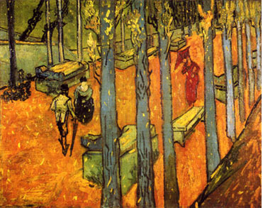 이런 기법의 차용은 고갱의 입장에서 본다면 흔한 일이라고 보기 어렵다. 평소에 인상주의를 극복하기 위해서 노력했던 고갱이었기에 더욱 그렇다. 반 고흐는 이 그림을 그릴 당시 분위기에 대한 훌륭한 묘사를 편지에서 전해주고 있다. 낙엽이 마치 눈처럼 쏟아지는 곳에 앉아서 둘은 알리스캉의 풍경을 화폭에 담았다. 가을이었지만 태양은 여전히 화사했고, 하늘은 구름 한 점 없이 맑았다. 전형적인 남프랑스의 가을 풍경이 청명하게 펼쳐졌던 것이다. 다가올 비극에 아랑곳없이 이 시간만은 고갱과 반 고흐에게 이상적인 순간이었을 것 같다.