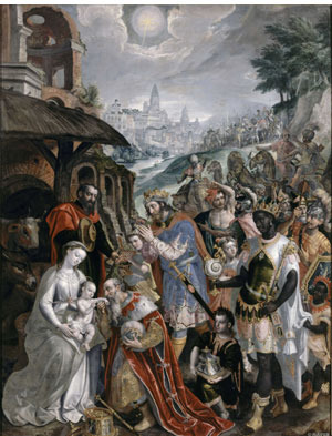 16세기 플랑드르에서 활동했던 마틴 데 보스(Martin de Vos)의 작품은 낙타를 비롯한 이국적인 풍물로 가득차 있다. 아기예수의 손에 입을 맞추는 유럽인, 손을 모아 경배를 드리는 아시아인, 그리고 아프리카 출신은 가장 젊은 모습으로 그려졌다. 이렇게 동방박사를 세 대륙을 상징하는 인물로 묘사하는 것은 그리스도의 구원이 모든 지역과 모든 세대에 미치고 있음을 상징적으로 드러낸 것이다.