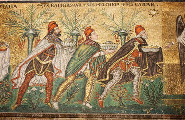 이제 6세기에 이르면 이들의 이름이 멜키오르(Melchior), 가스파르(Gaspar), 발타사르(Balthasar)로 언급되었다. 6세기 라벤나의 산 아폴리나레 누오보(Sant' Apollinare Nuovo)성당의 모자이크에는 이들이 이름과 함께 보다 구체적으로 묘사되었다. 이들은 동방에서 온 이들답게 페르시아 풍으로 프리지안 모자, 짦게 두른 튜닉, 레깅스, 망토를 입고 있다. 또 이들의 수염은 나이를 짐작케 해준다. 맨 앞의 가스파르는 하얀 수염으로 미루어 노인, 가운데 멜키오르는 수염이 없는 청년, 맨 뒤의 발타사르는 갈색수염이 있는 중년의 모습이다. 등장인물의 이름이 써있는 상단, 바로아래 여덟 개의 빛줄기를 발하는 별이 있다. | |
