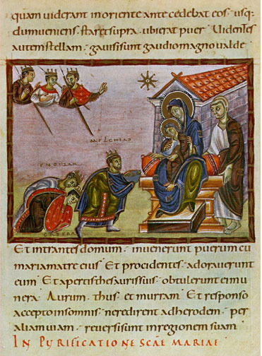 또 [고대 아르메니아 원전]에 따르면 동방박사들은 페르시아, 인디아, 아라비아의 왕이자 조로아스터교인들이며 천문학자였다고 전한다. 10세기에 제작된 코덱스 에그버티(Codex Egberti)의 세밀화는 관을 쓰고 있는 동방의 왕으로 묘사되었는데, 맨 앞의 멜키오르가 가장 연장자로 표현되었다. 그 뒤에 무릎을 꿇고 있는 청년 가스파르와 중년의 발타사르가 있다. 즉 산 아폴리나레 누오보의 [경배]와 비교하면, 멜키오르와 가스파르의 나이가 달라진 것이다. 이같은 혼란으로 미루어보아 누구를 가장 연장자로 그리는가의 문제는 작가에게 달려있었던 것으로 추측할 수 있다. 그러나 가장 나이가 많은 사람이 제일 앞에 그려졌으며, 1200년경 제작된 잉게보르그(Ingeborg) 시편에서는 더 이상 그들의 이름은 나타나지 않고, 나이순으로 세 왕을 그리고 있다. 코덱스 에그버티에는 화면 왼쪽 상단, 별을 보고 찾아오는 세 왕의 여행장면이 함께 그려져 있으며, 잉게보르그 시편에는 헤로데 왕에게 유다인의 왕이 어디서 났는지를 묻고 있는 장면이 연속적으로 나타난다. | |