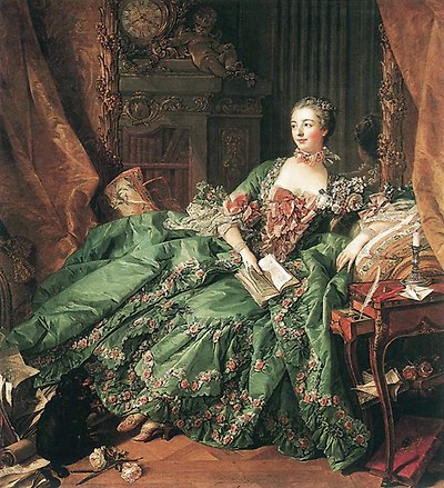 초록 비단 드레스의 마담 드 퐁파두르는 어느 초상화보다 생기있으며 확고한 자신감이 엿보인다. 역시 ‘벨 사방’의 모습이다. 후작부인의 작위를 받아 국왕 루이 15세의 공식 정부로 승인되고 난 후(1745), 이어서 공작부인(1752)으로 승격해 당시 여성으로서 성취할 수 있는 최고 권력에 올라섰을 때의 모습이다. 그에 더해 베르사이유의 수석 레이디(사라진 직책이라 번역되지 않지만 굳이 번역하자면 왕비 바로 다음가는 (여성) 총리에 해당하는 자리. 직속 정무수석 정도 될까? 이 직책의 레이디는 왕비의 거처 바로 옆에서 대기하고 있어야만 했다)로 임명되기도 했다. 책을 들고 느슨하고 자연스럽게 기대앉은 자세는 몸을 곧추 세워 앉거나 서있는 일반적인 딱딱한 왕가 초상화 관례와는 구별되는 요소이다. | |