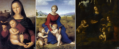 [도판 1]은 라파엘로가 19살 때 페루자에 그린 것이고 [도판 2]는 6 년 후 25살 때 피렌체에서 그린 것이다. 두 그림을 살펴보면 라파엘로가 얼마만큼 빠르게 성장해 나갔는지를 알 수 있다. [도판 2]는 안정된 정삼각형 구도 하에서 우아한 눈짓과 손짓으로 이어지는 심리적 연대감을 보여 준다는 점에서 레오나르도 다 빈치의 성모자상 [도판 3]을 강하게 연상시킨다.