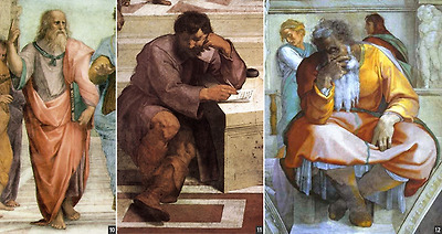 한편 [아테네 학당] 화면 정 중앙에 서 있는 흰 수염의 플라톤이 레오나르도 다 빈치의 실제 모습을 기초로 그려진 것으로 알려져 있기 때문에 고대 철학자 헤라클레이토스가 미켈란젤로의 모습을 기초로 그려졌다 해도 전혀 이상하지 않을 것이다. [아테네 학당]에서 플라톤의 모습을 한 레오나르도 다 빈치는 한 손으로 하늘을 가리키고 있다. 플라톤 철학의 형이상학적 가르침을 조형적으로 형상화한 것이지만, 레오나르도 다 빈치가 추구한 공상적 세계를 우회적으로 보여주는 것 같다.
