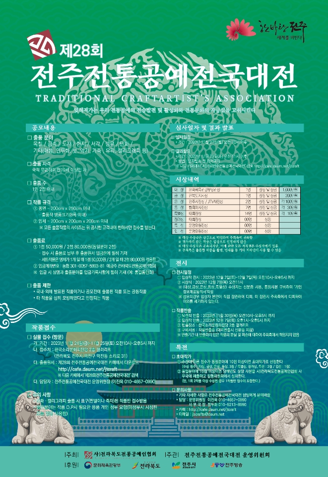 제28회 전주전통공예전국대전 모집요강 작성자청원|작성시간23.08.28|조회수141 목록 댓글 0 글자크기 작게가 글자크기 크게가 다음검색 현재 게시글 추가 기능 열기 북마크 공유하기 신고 센터로 신고 댓글 댓글 0 댓글쓰기 답글쓰기 댓글 리스트