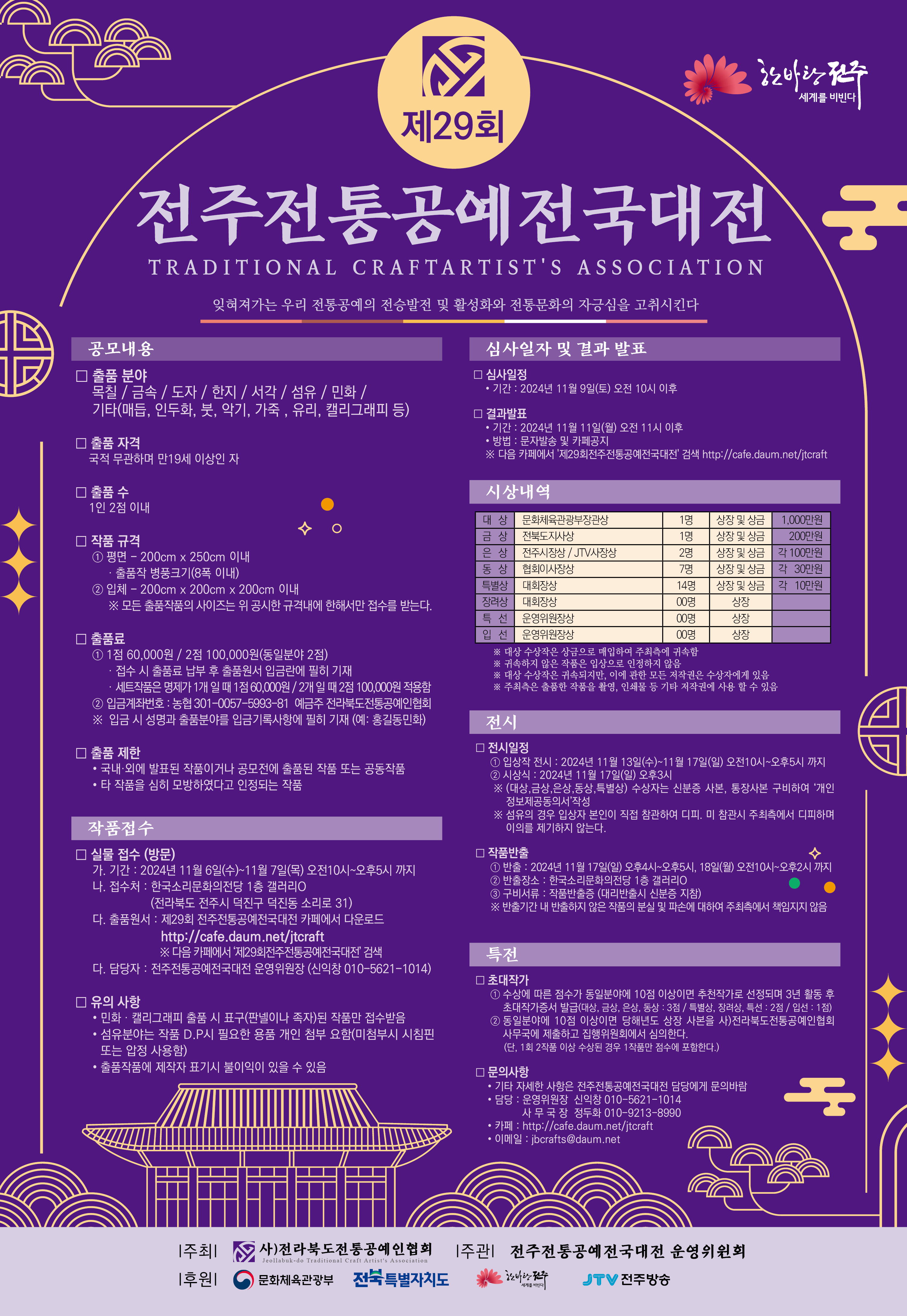 제29회 전주전통공예전국대전 모집요강 작성자전주전통공예전국대전|작성시간24.08.12|조회수1,155 목록 댓글 0 글자크기 작게가 글자크기 크게가 모집요강_포스터.jpg4.61MB 첨부파일첨부된 파일이 2개 있습니다. jpg 파일 모집요강_포스터.jpg 다운로드 jpg 파일 모집요강_포스터.jpg 다운로드 다음검색 현재 게시글 추가 기능 열기 북마크 공유하기 신고 센터로 신고 댓글 댓글 0 댓글쓰기 답글쓰기 댓글 리스트