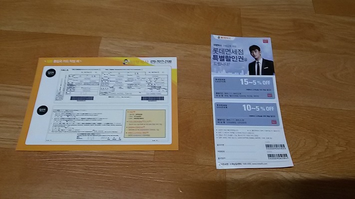 롯데면세점 할인권과 일본 입국카드 작성의 예시가 들어있었습니다.