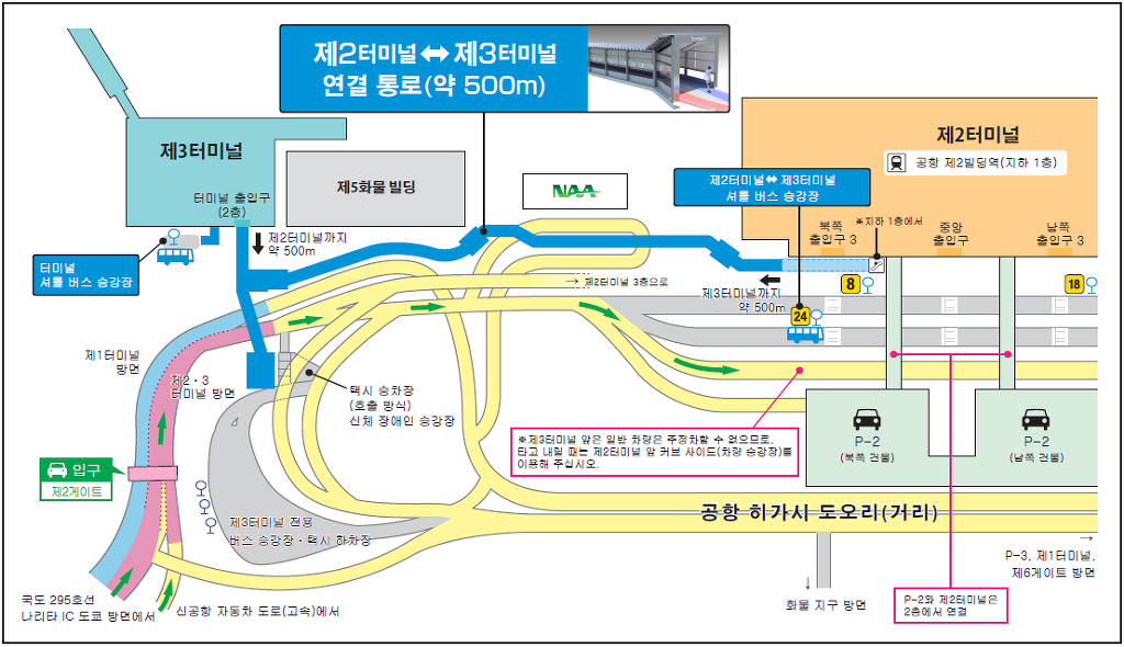 (3터미널이 2터미널 북쪽에 건설된 관계로 2터미널에서 이동하는 것이 1터미널에서 이동하는 것 보다 여러모로 편리합니다.)