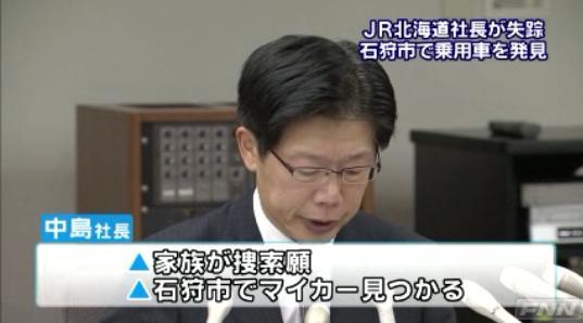 [JR홋가이도 12일 오후 기자회견] 나카지마 나오토시(中島尚俊) 사장 행방 불명-가족들에게 메모 남겨, 승용차만 발견